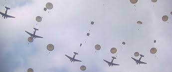 de centenas de paracaidistas desde decenas de aviones, el colosal movimiento de
