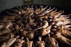 escalofriante imagen de un tótem de cuerpos humanos entrelazados, salido esto