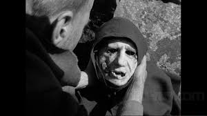 capucha, y con la tez pálida, se identifica como la muerte (Bengt Ekerot),